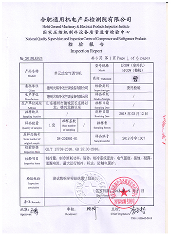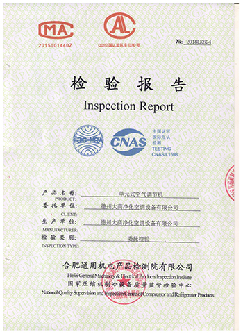 2018年3月,德州大商凈化空調(diào)設(shè)備有限公司所生產(chǎn)的單元式空氣調(diào)節(jié)機(jī)獲得認(rèn)證檢驗(yàn)中心——合肥通用機(jī)電產(chǎn)品檢測(cè)院有限公司(壓縮機(jī)制冷設(shè)備質(zhì)量監(jiān)督檢驗(yàn)中心)出具的檢驗(yàn)報(bào)告。